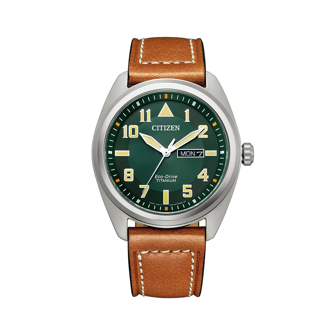 Esfera verde y correa de cuero marrón